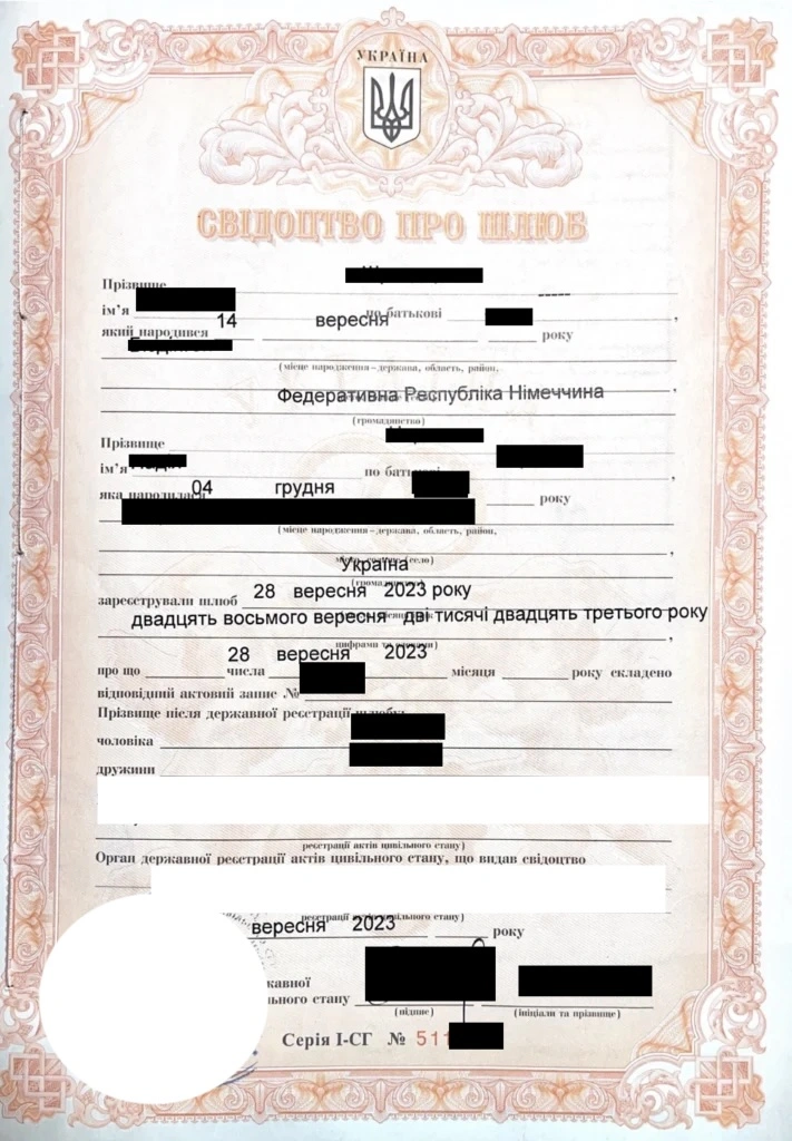 ➡︎ Брак в Германии для украинцев, как и для других иностранцев, является сложным процессом. Гораздо проще всё происходит в Украине, а свидетельство о браке украинского образца признают все страны мира. Для использования свидетельства о браке украинского образца в Германии достаточно будет проставить на нем апостиль. Проставлением апостиля на свидетельстве о браке занимаются наши юристы.